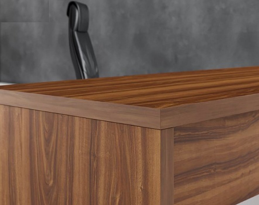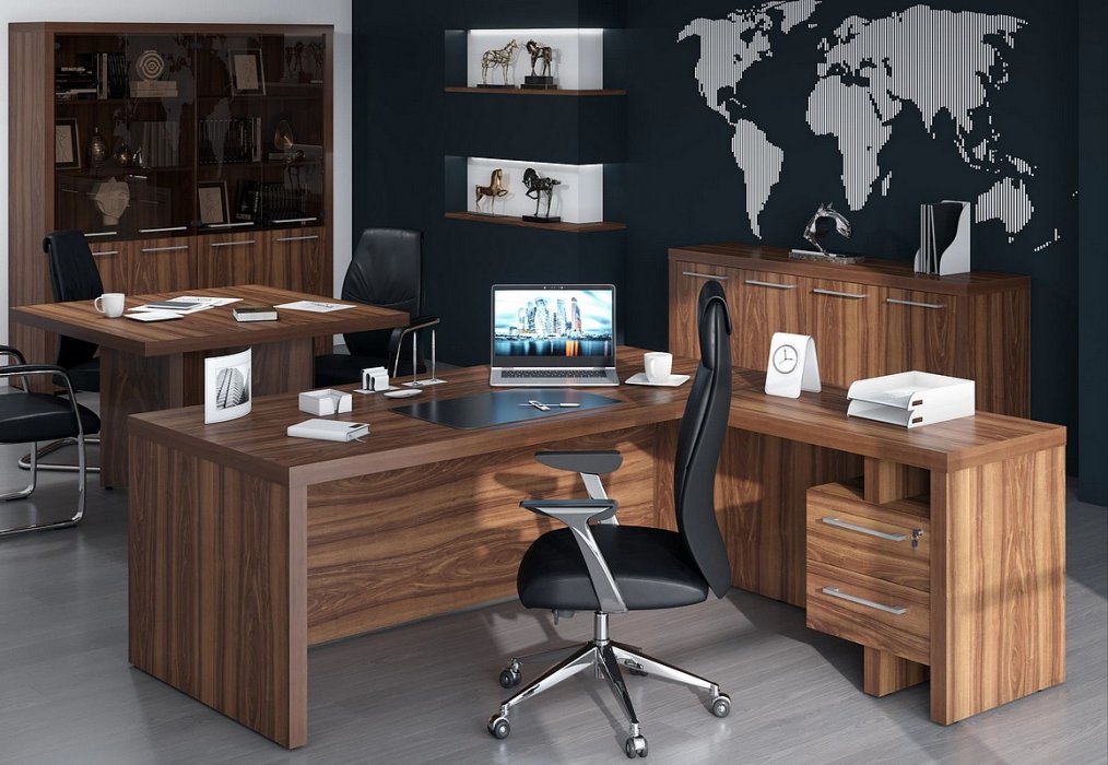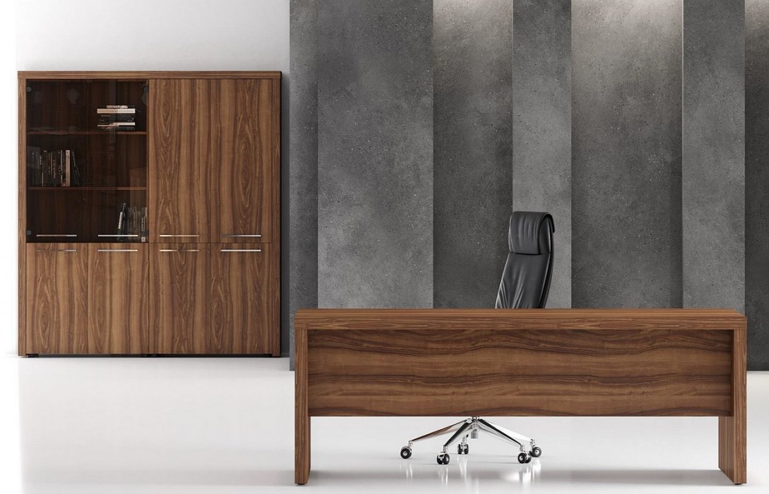 Кабинет, сочетающий в себе современные минималистичные формы и солидность традиционной классической мебели. Столешница и опоры толщиной 54 мм. Массивные, основательные. Декор - классический орех с яркой текстурой - сама респектабельность. А прямые, рубленые формы позволяют использовать ZENN и в традиционных кабинетах, и в современных открытых офисах. И там, и там он будет великолепен.